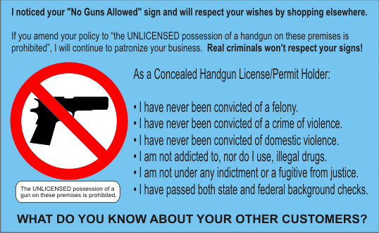 The following is a list of businesses that are NOT firearm friendly. I highly recommend that you do not patronize these establishments. I have personally verified every establishment on this list. Additions will be added as I personally come across them.