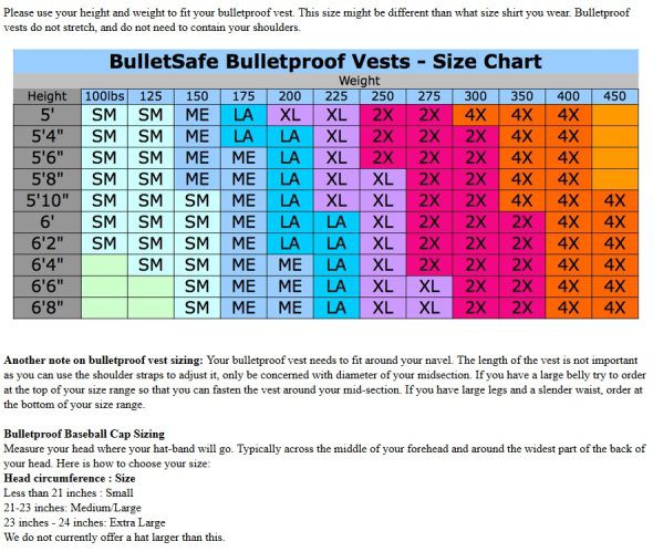 BulletSafe Bulletproof Vest Size Chart