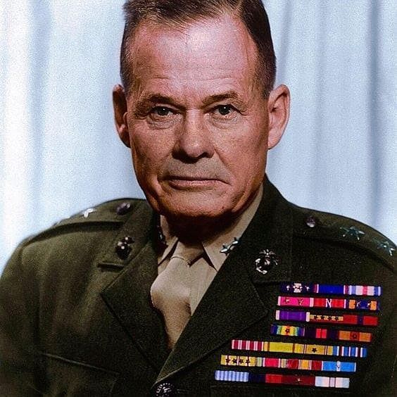 Lewis B (Chesty) Puller – retired as a Lieutenant General (3 star) USMC (1898 to 1971). He was a Major General (2 star) in this picture